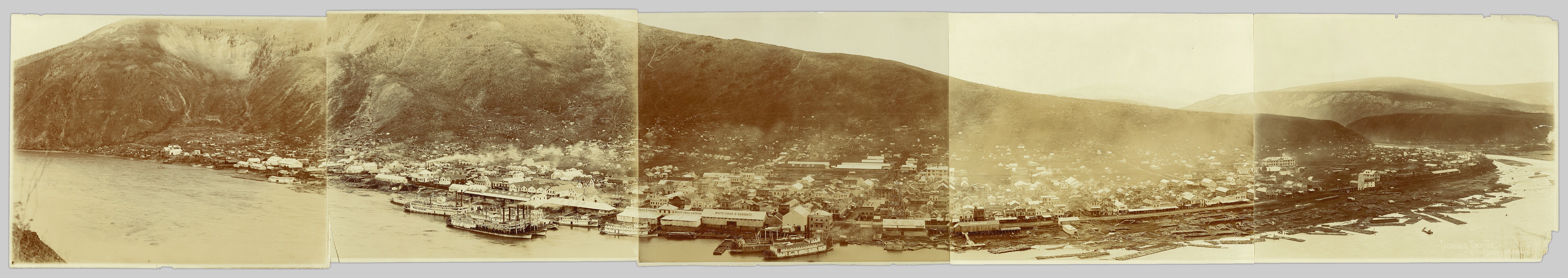 Photograph depicts a panorama view of Dawson, as seen from across the Yukon River. Panorama is made up of five prints.