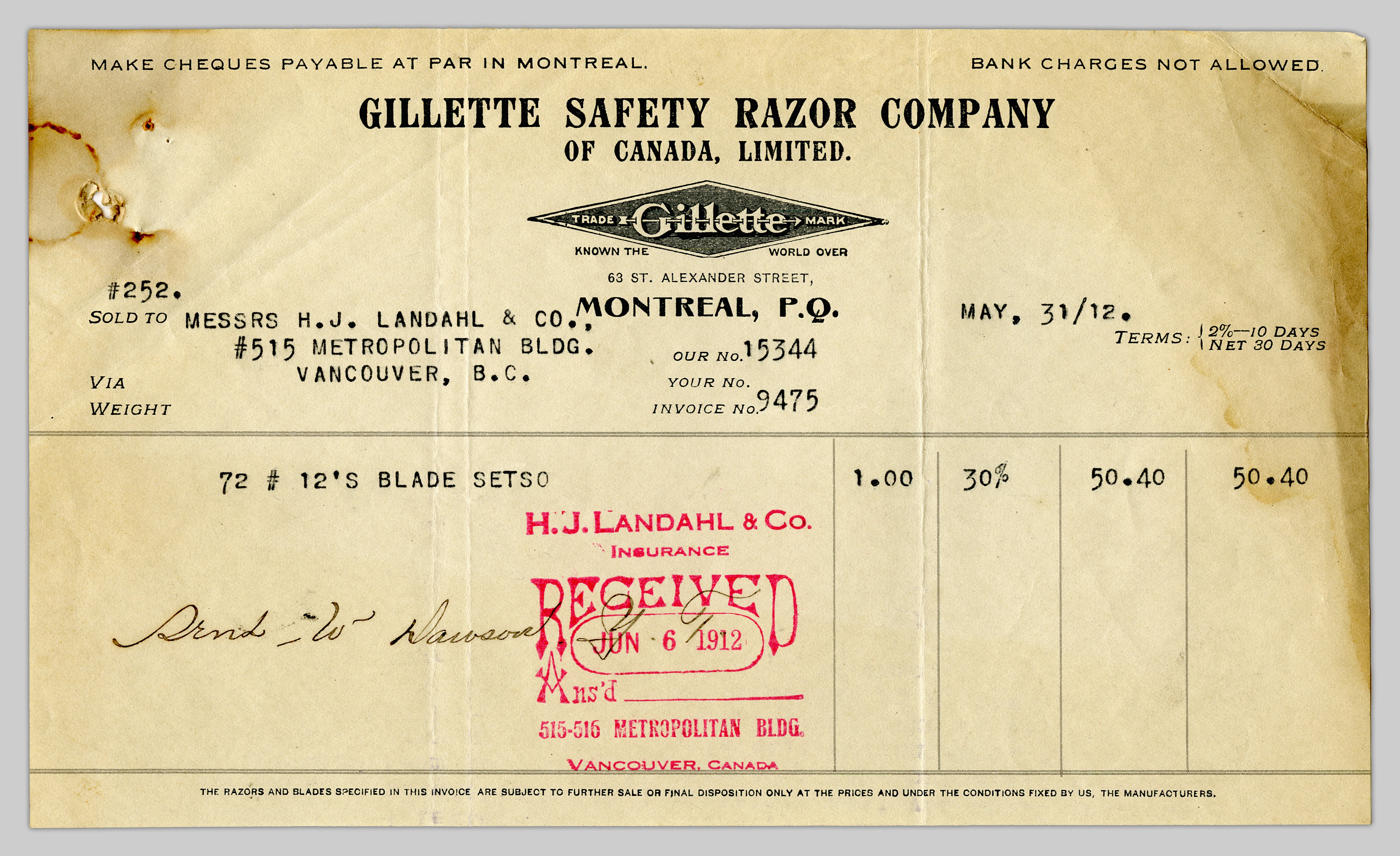 [Invoice from Gillette Safety Razor Company of Canada to H. J. Landahl & Co.]