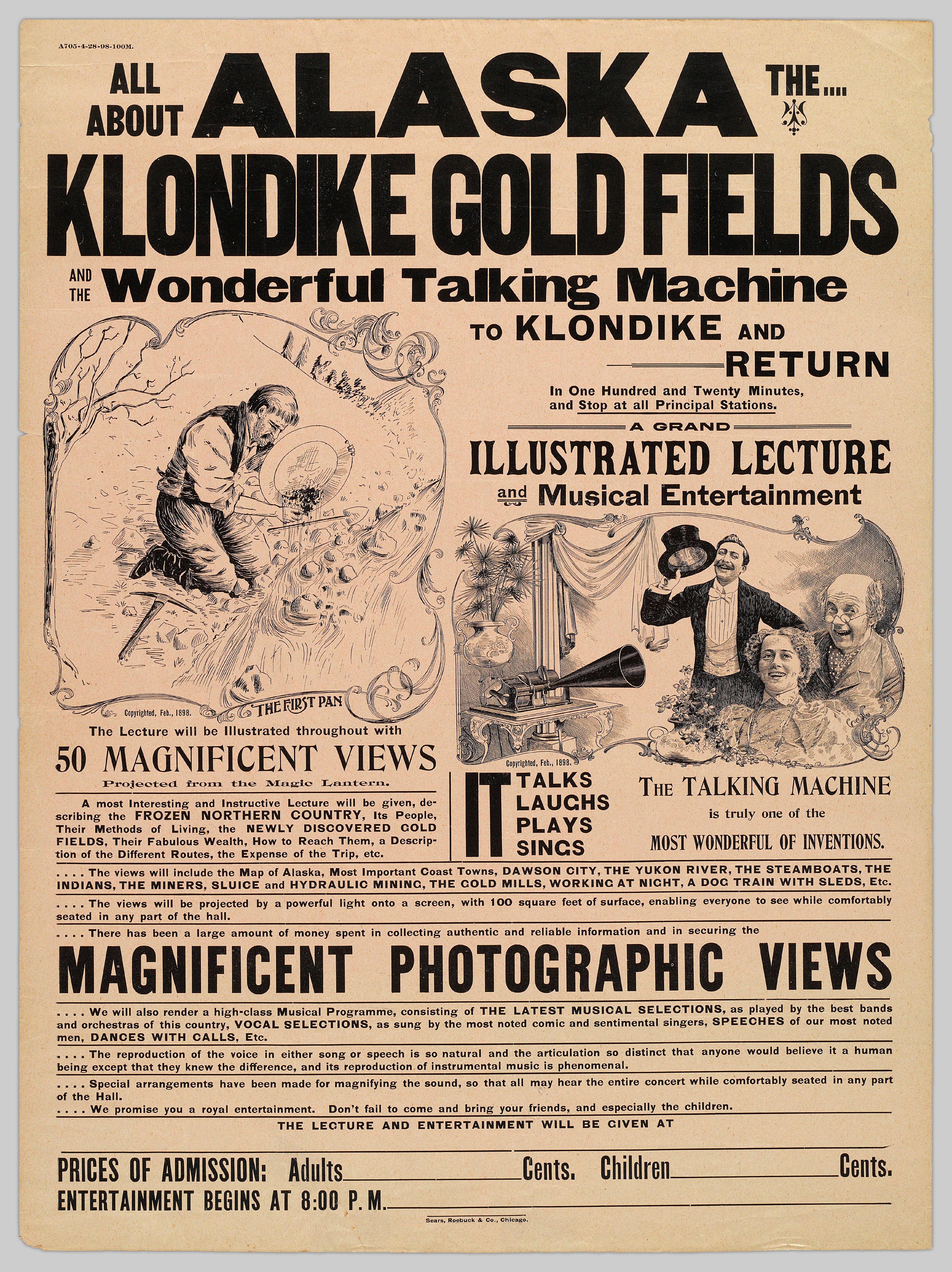 Poster advertisement for the illustrated lecture "All About Alaska: The Klondike Gold Fields and the Wonderful Talking Machine." Poster includes two illustrations.