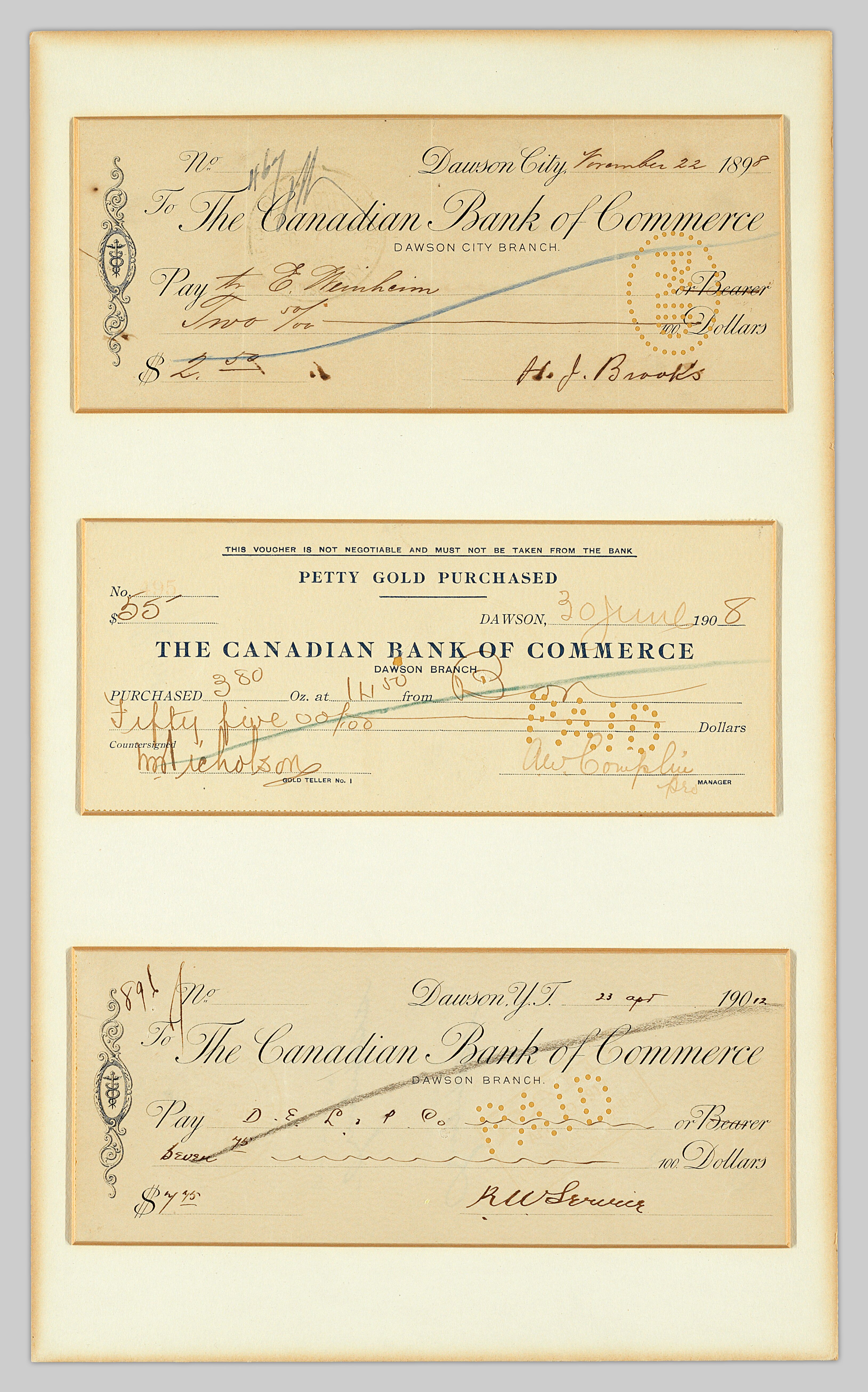 One of the cheques was written by Robert Service while he was working as a teller for the Canadian Bank of Commerce at Dawson.