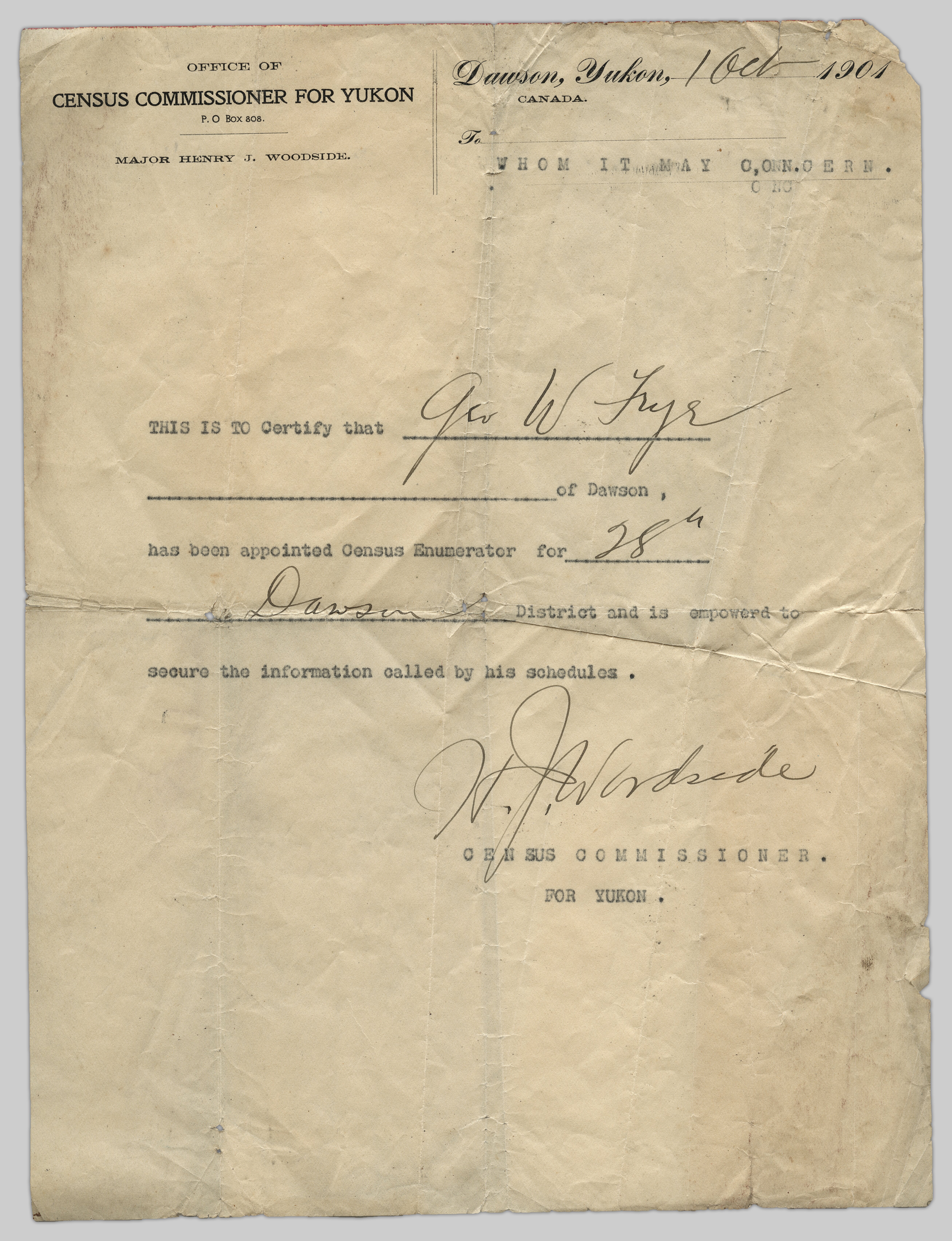 Certificate granted by Henry J. Woodside to appoint Geo W. Frye as census commissioner of Dawson.