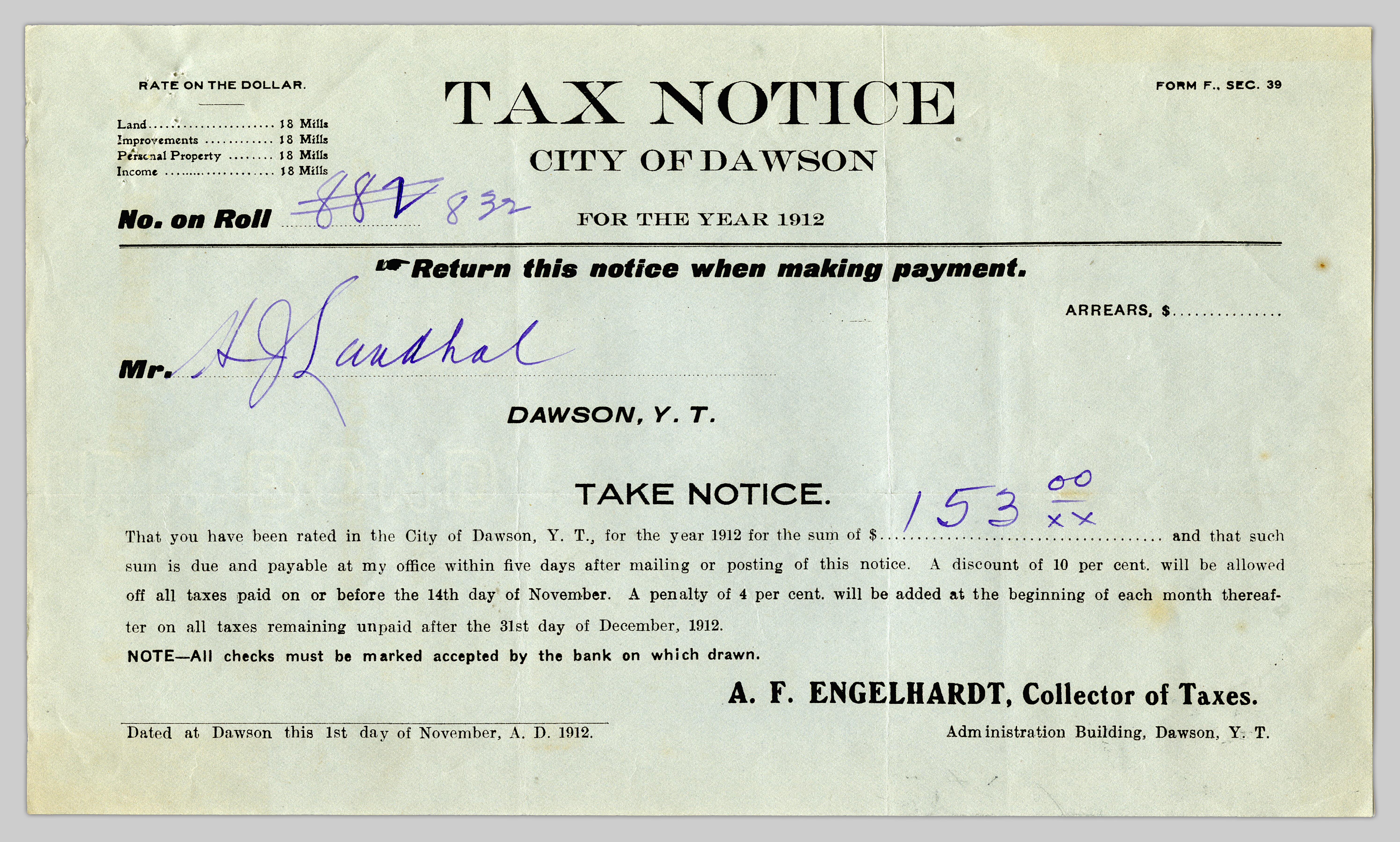 [Tax notice for H. J. Landahl for the year 1912. City of Dawson]