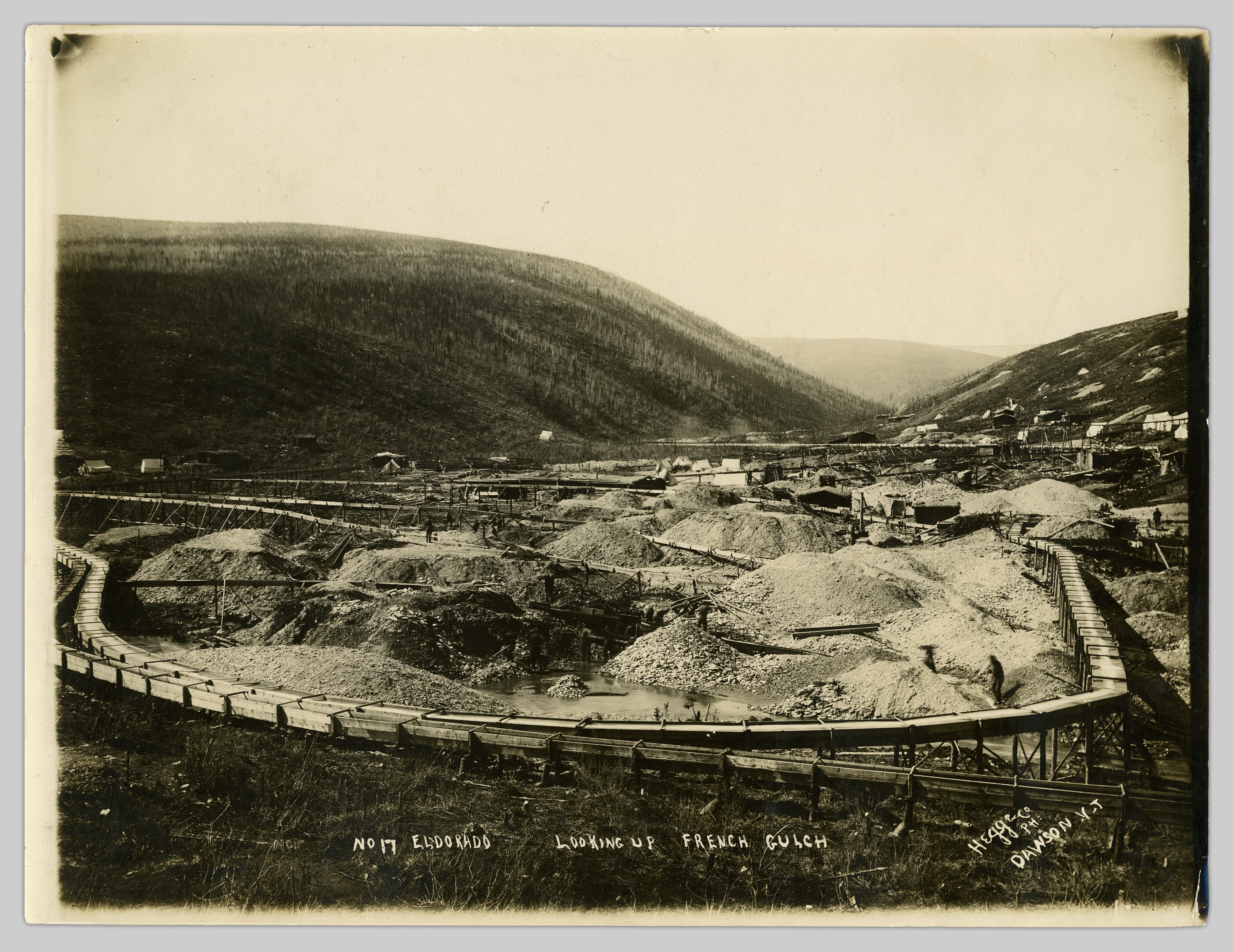 Photograph depicts sluice channels at a mining operation on Eldorado Creek.