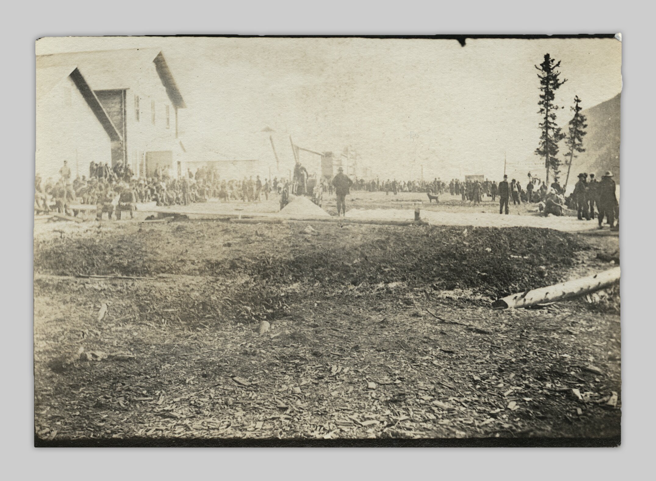 Photograph depicts a crowd gathered around a clearing. A section of the ground appears to have been sectioned off and recently upturned.
