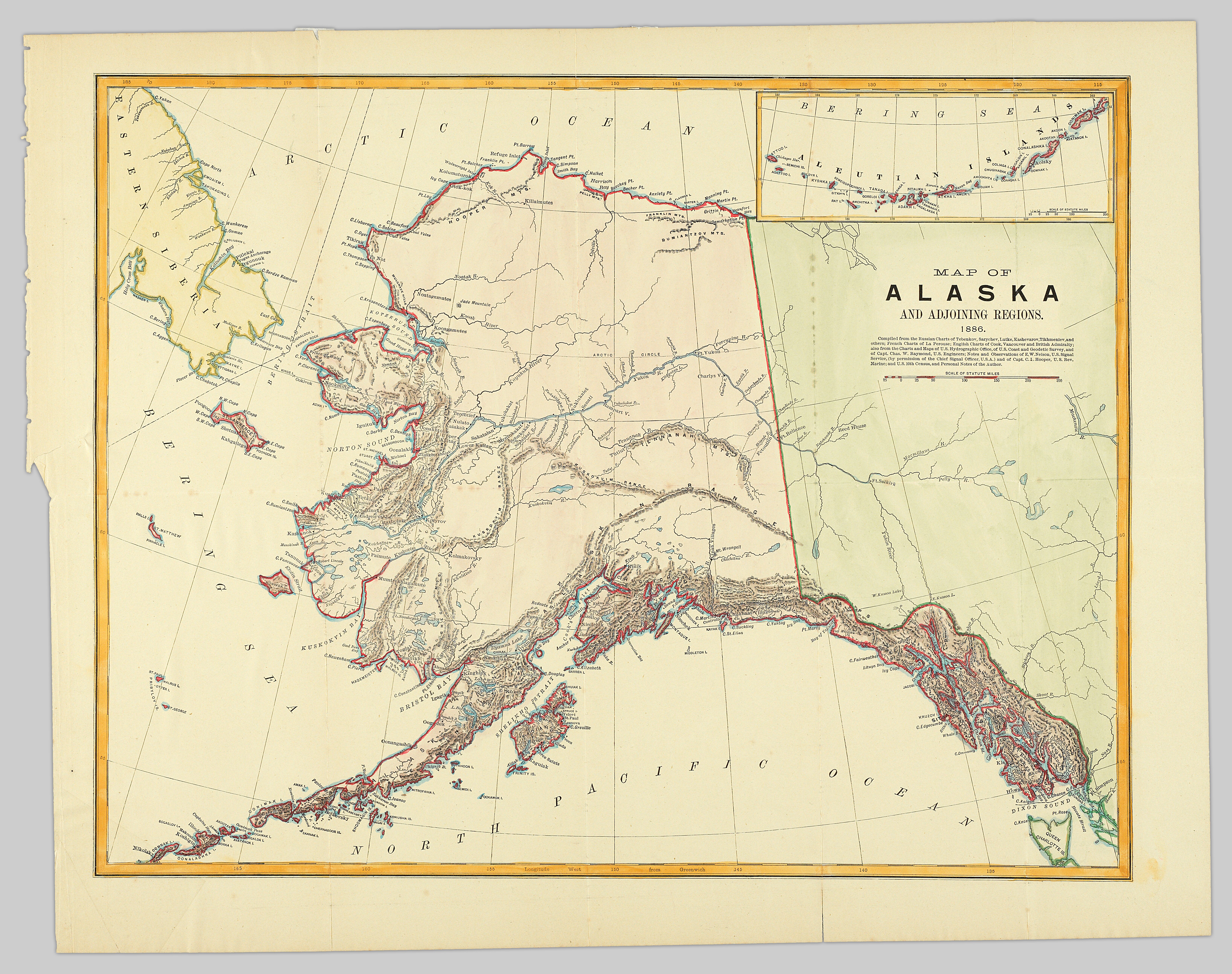 Handcoloured map of Alaska and adjoining regions. Shows Indigenous settlements, posts, and rivers. Relief shown by hachures. Includes inset of Aleutian islands (scale approximately 1:9,504,000; 1 inch equals approximately 150 statute miles).